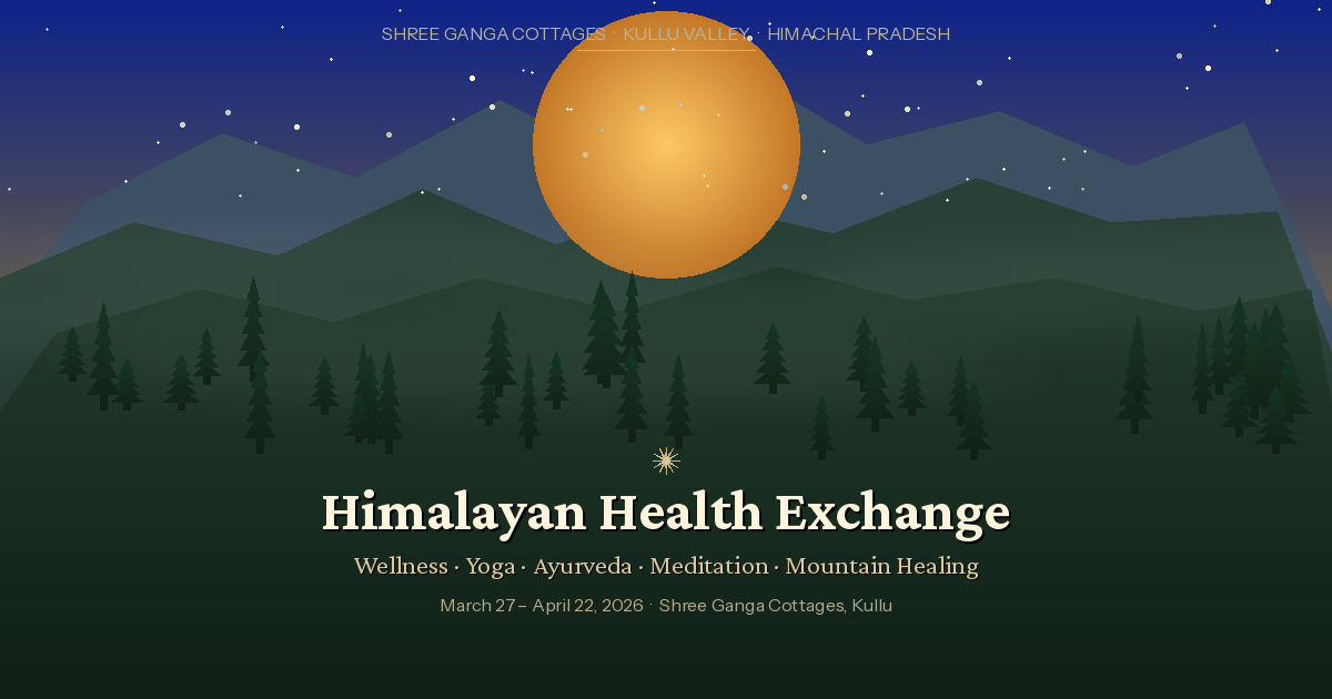 A transformative 6-day wellness journey awaits at Shree Ganga Cottages, nestled in the serene Kullu. The Himalayan Health Exchange brings together seekers of holistic well-being for an immersive experience of yoga, Ayurveda, meditation, and natural healing — all set against the majestic backdrop of snow-capped peaks, flowing rivers, and ancient apple orchards.
