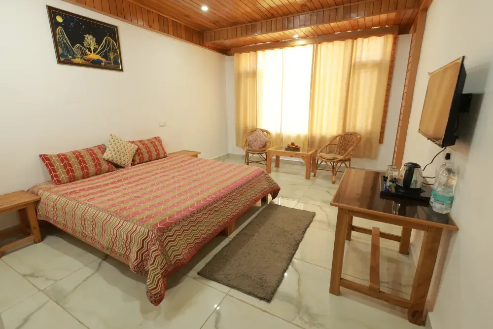 Enjoy a comfortable and peaceful stay in our Deluxe Room, thoughtfully designed for relaxation amidst the beauty of the mountains. The room features warm interiors cozy lightning, and modern amenities to ensure a pleasant experience for couples, families, and leisure travelers. Each Deluxe Room comes with a comfortable bed, attached bathroom with modern fittings, and 24-hour hot & cold eater. Large windows allow you to enjoy scenic views and natural light throughout the day.